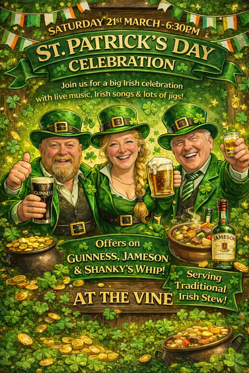 Join us for a proper celebration with live music, Irish songs and plenty of jigs, plus great offers on Guinness, Jameson & Shanky’s Whip.